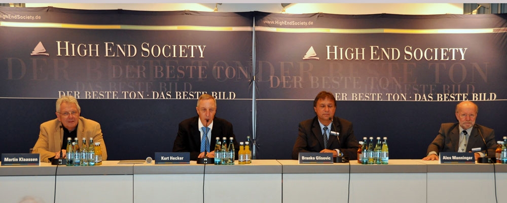 Kurt Hecker (Vorsitzender des Vorstandes der HIGH END Society e.V. 2.v. l.) erklärte: Neben den vielen deutschen Vertrieben, die sich in diesem Jahr wieder groß präsentierten, hat auch die internationale Ausrichtung der HIGH END deutlich zugenommen. Ca. 50 % der Aussteller sind ausländische Unternehmen. Damit unterstreicht die HIGH END eindrucksvoll ihre Position als europäische Leitmesse.