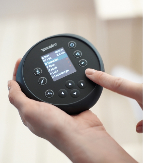 Die Inipi-Sauna von Duravit bietet neben gesundheits-fördernden Schwitzkuren zusätzliche Funktionen. Der Saunist kann Temperatur, Luftfeuchtigkeit, Farblicht und Sound über eine Fernbedienung individuell einstellen. Bevorzugte Kombinationen können als Nutzerprofile gespeichert werden. Zusätzlich sorgen voreingestellte Szenarien für Abwechslung: Jungle, Desert, Asia, Mediterranea oder Indian entfalten in puncto Luftfeuchtigkeit oder Temperatur ihre Wirkung, und sind zudem vom passenden Sound begleitet. Als platzsparende Alternative bietet die Kompaktsauna Inipi B auch auf kleinstem Raum höchstes Sauna-vergnügen.