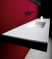 Die Besonderheit bei der Serie No. 2 ist der aus einer Mineralwerkstoffplatte auf Maß gefertigte Einzel- bzw. Doppelwaschtisch. Das Becken ist nach Wunsch platzierbar, die Waschtischplatte bietet zusätzliche Ablagefläche. Die auf Maß gefertigte Ablagefläche kann wahlweise auf einer Konsole montiert oder passgenau für die Kombination mit nahezu allen gängigen Möbellieferanten gefertigt werden. Sie ist damit universell einsetzbar. Die Befestigung ermöglicht komplette Bein- und Barrierefreiheit. Werden andere Trägerelemente als Ablage verwendet, kommen die Halbeinbauvariante oder der Aufsatzwaschtisch zum Tragen. Die Armatur wird bei Unique No. 2 wandseitig gesetzt.