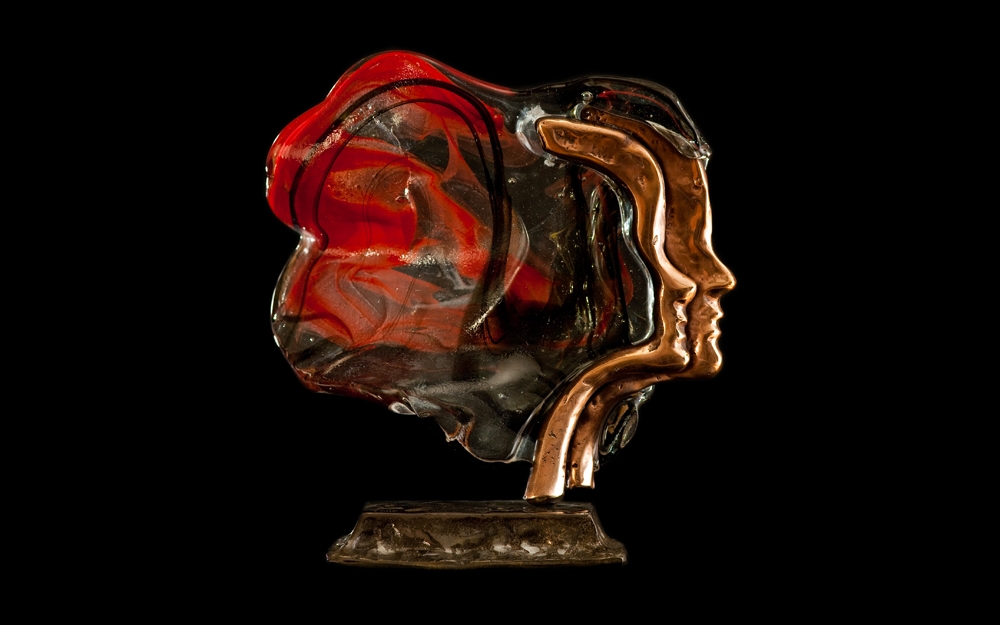 Skulptur Duo PM aus Glas und Bronze auf einem Bronze-Sockel des Künstlers Yves Lohe, geb. am 05.03.1947 in Nordfrankreich. Jede Skulptur ist ein handgearbeitetes Einzelstück.