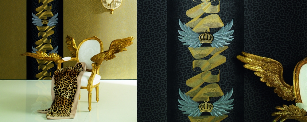 Tapeten mit schwarzer Leoparden- Optik mit goldenen Schleifen und silbernen Engelsflügen, die aus mehreren Kronen empor schweben, weiße Tapeten mit filigranen silbernen Applikationen und Quasten oder auch reine, goldfarbene Tapeten mit und ohne barocke Details.“
