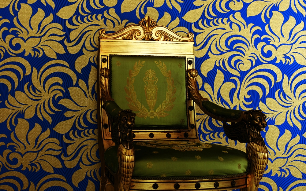 Royalblaue Tapeten mit kreisförmigen Anmutungen oder goldenen Applikationen, rote Tapeten verziert mit Strasssteinen und der funkelnden Pompöös-Krone, aber auch schwarze mit glitzernden Steinen, die ein schwarzer barocker Rahmen schmückt.