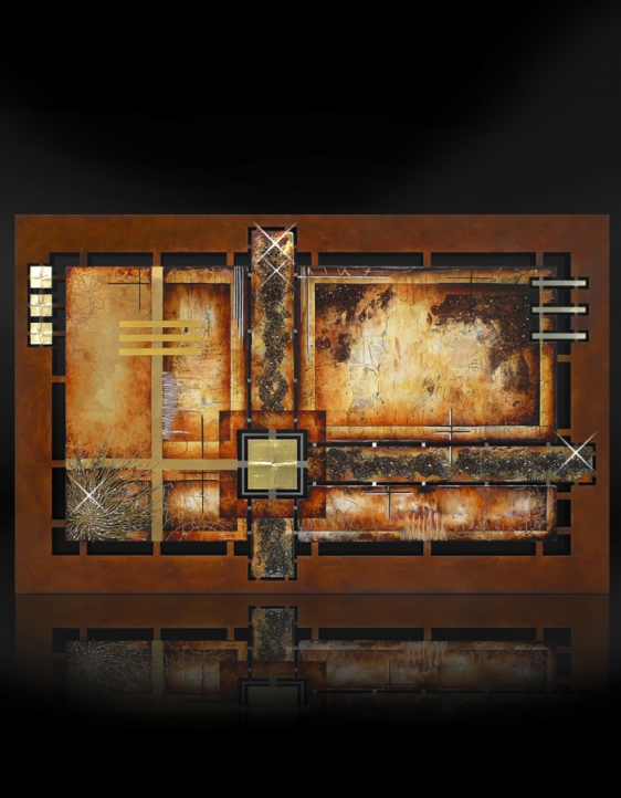 Die farbintensiven Gemälde werden mit reflektierenden Materialien wie Swarovski-Kristallen, Blattgold, vergoldetem Sand oder mit Platin überzogenen Glassplittern weiter veredelt, der 3D-Charakter weiter intensiviert.