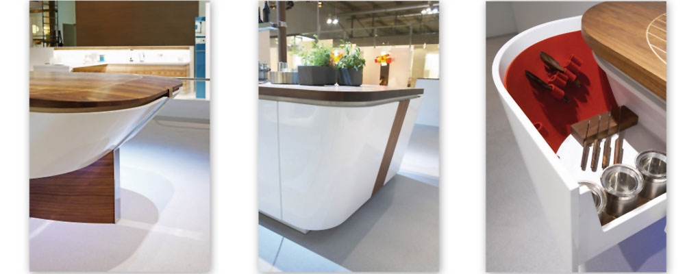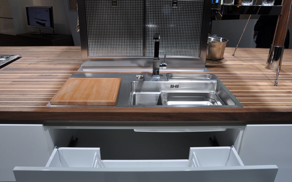 Exzellent verarbeite ist die Arbeitsfläche aus Naturholz. Für einen Moment vergaßen wir beim Anblick, dass wir vor einer Küche stehen und es kam das Gefühl, das Innere einer Yacht zu besichtigen, edel und mächtig. Aber bitte keine Bedenken; Die MARECUCINA von ALNO passt sich gerne Ihrer Küchengröße an ohne ihre imposante Eleganz zu verlieren. Raffiniert sind die Stauflächen auch in den Rundungen gelöst, kein Platz wird verschenkt.