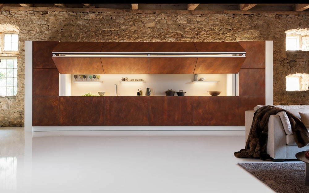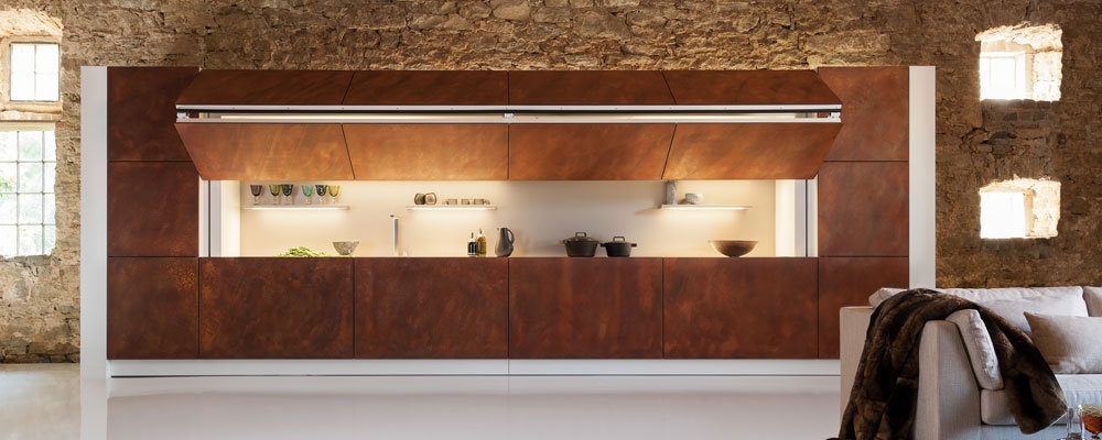 Die visionäre ‚Hidden Kitchen‘ tarnt sich durch einen Knopfdruck hinter einer Schrankwand und repräsentiert damit den Look&Feel Warendorfs. Ihr einzigartiges Design und ihre Oberfläche aus natürlichem Rost fallen sofort ins Auge. Diese Küche im Wohnformat steht für eine integrierte Raumarchitektur und zeigt damit den Lifestyle-Anspruch der Premiummarke.