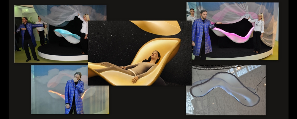 Eine zweite Liegeschale schwebt in gedrehter und gespiegelter Form über dem Besucher und dieser Wolkenhimmel vervollständigt dabei die räumliche Gesamtkomposition.